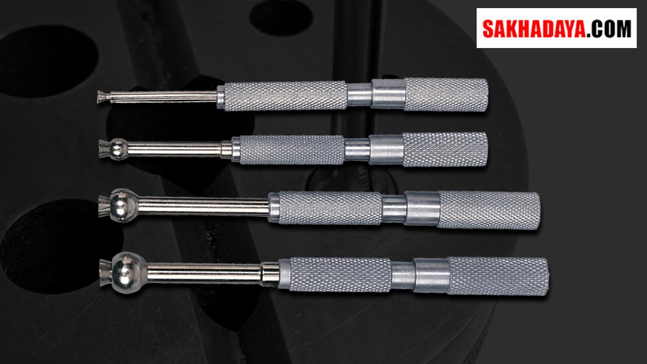 Alat ini dilengkapi dengan mekanisme yang dapat diperluas dan dikunci untuk mengukur diameter dalam sebuah lubang sebelum dibaca menggunakan mikrometer luar. - Small Hole Gauges